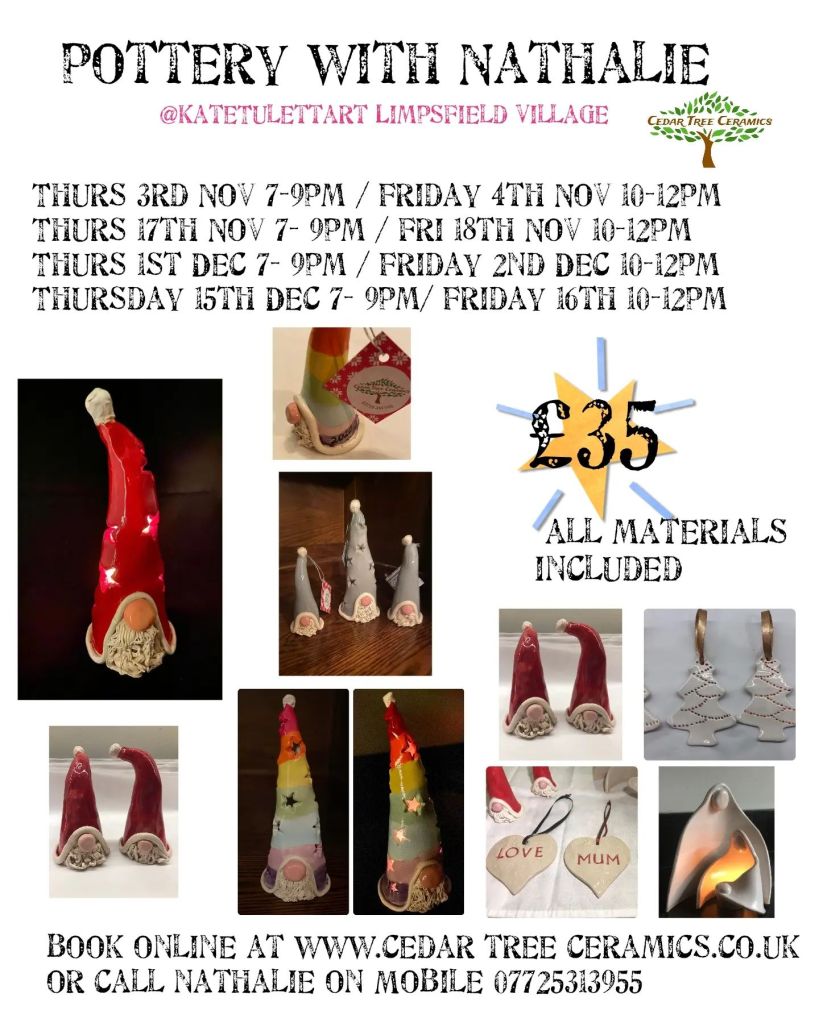 Fancy having a go at ceramics? We’re getting together with the fabulous Nathalie of Cedar Tree Ceramics to offer a series of relaxed, fun Christmas ceramic workshops throughout November and December, where you will be led through how to make these gorgeous gonks or hanging decorations and paint them, all at our art studio on Limpsfield High Street.