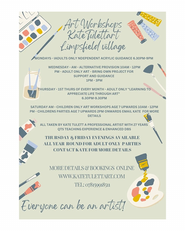 - Art for All workshops with Kate in July on 22/23/25/29/30/31 July – 10.00-15.00 ยฃ60