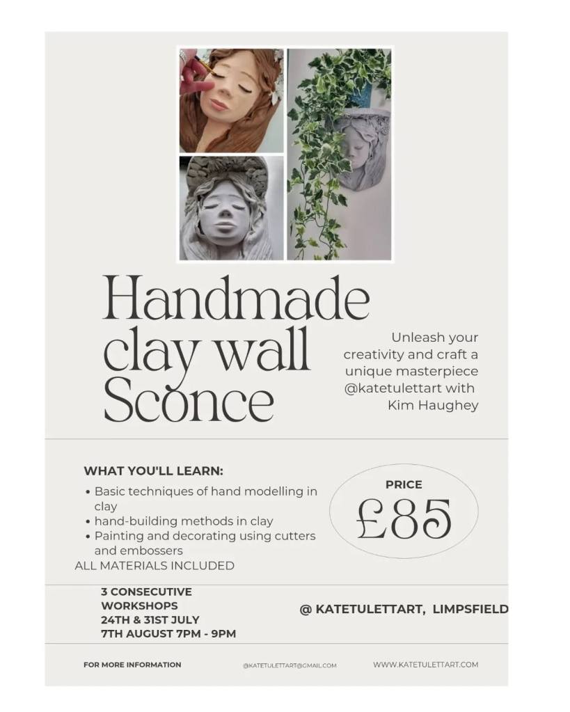 - Handmade Clay Wall Sconce workshops with Kim Haughey – 3 consecutive Wednesdays 24 & 31 July, 7th August, 19.00-21.00 ยฃ85.