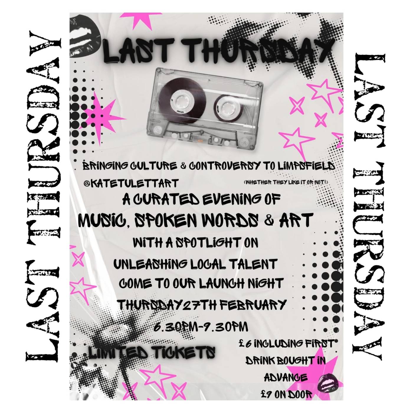 Tickets are £6 in advance, including a drink, £9 on the door and you can book your place direct from Kate’s booking page: https://katetulettartforallbooking.as.me/?appointmentType=72603924. Ideally please book in advance as there is limited space.
